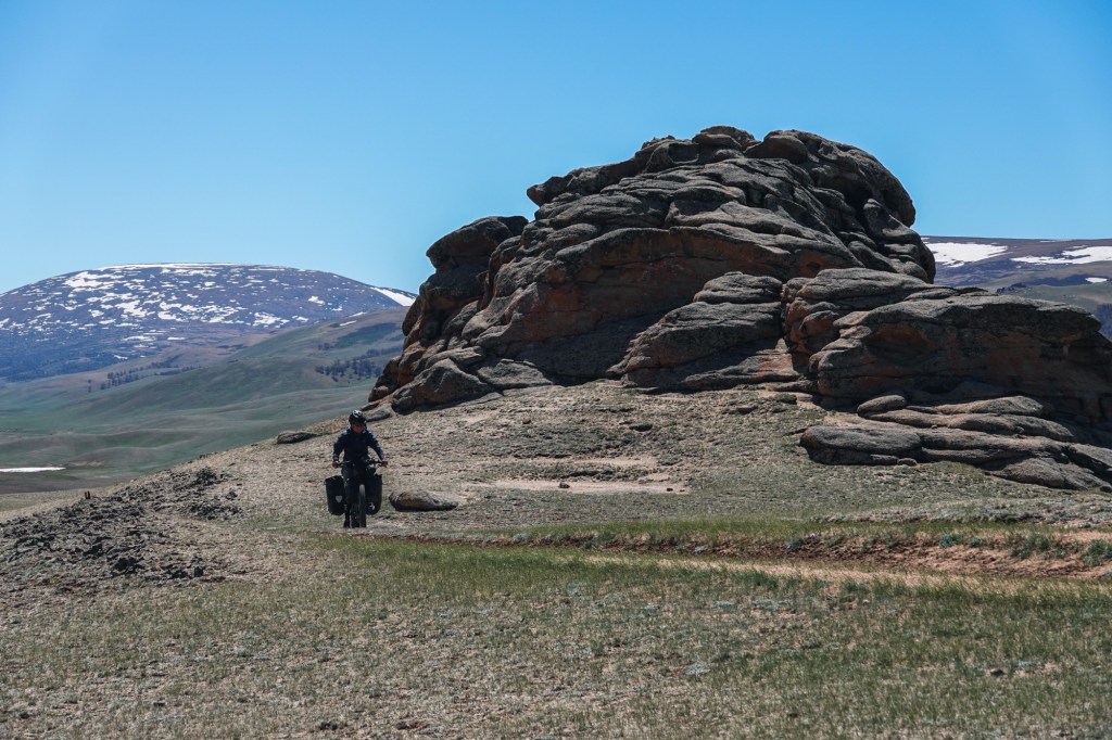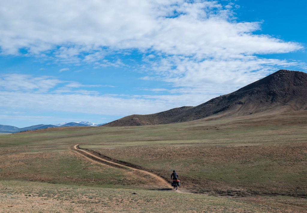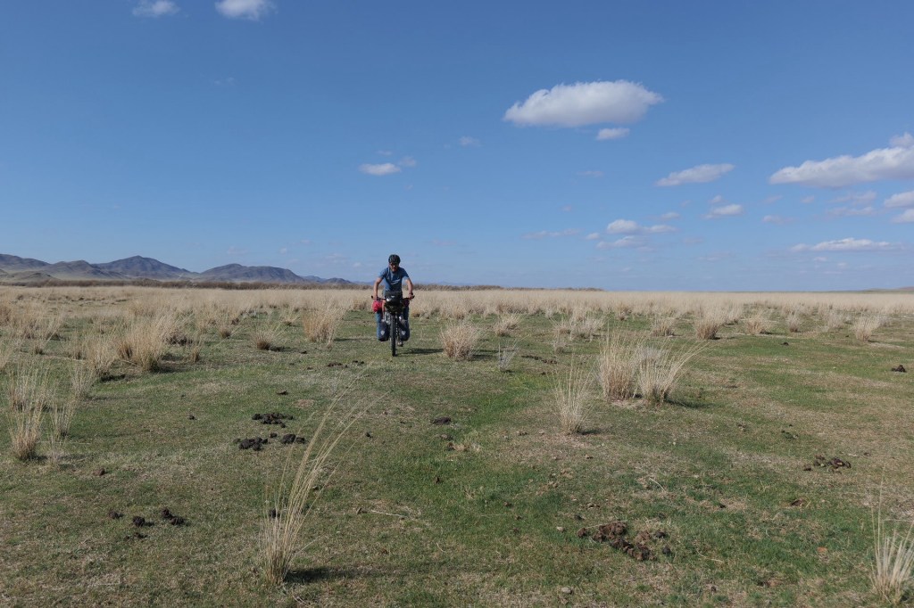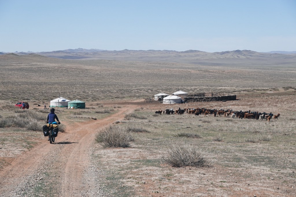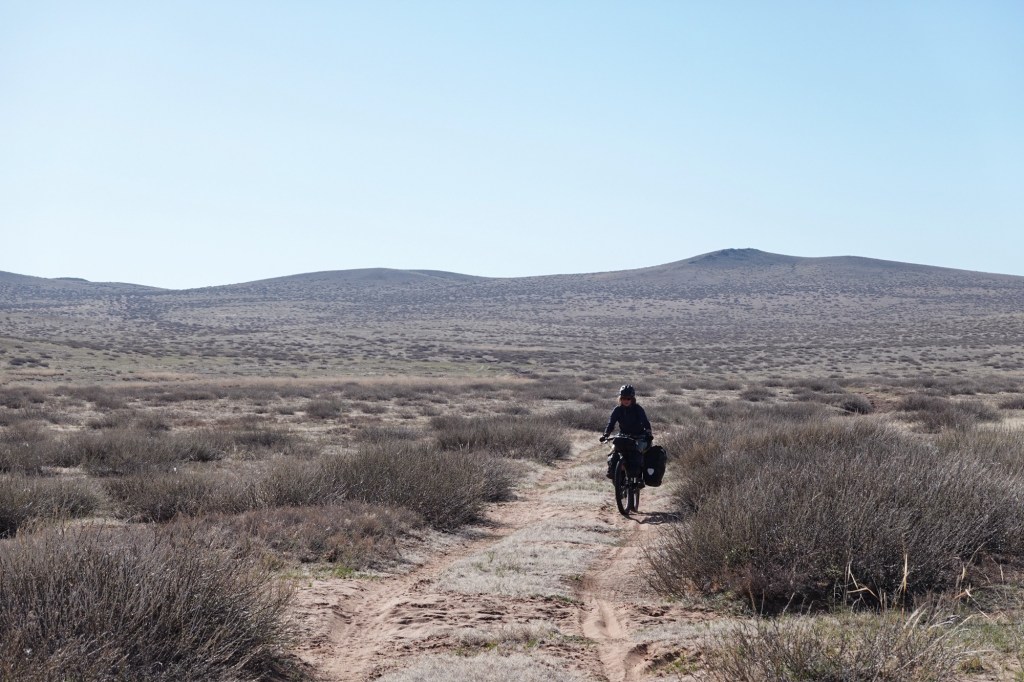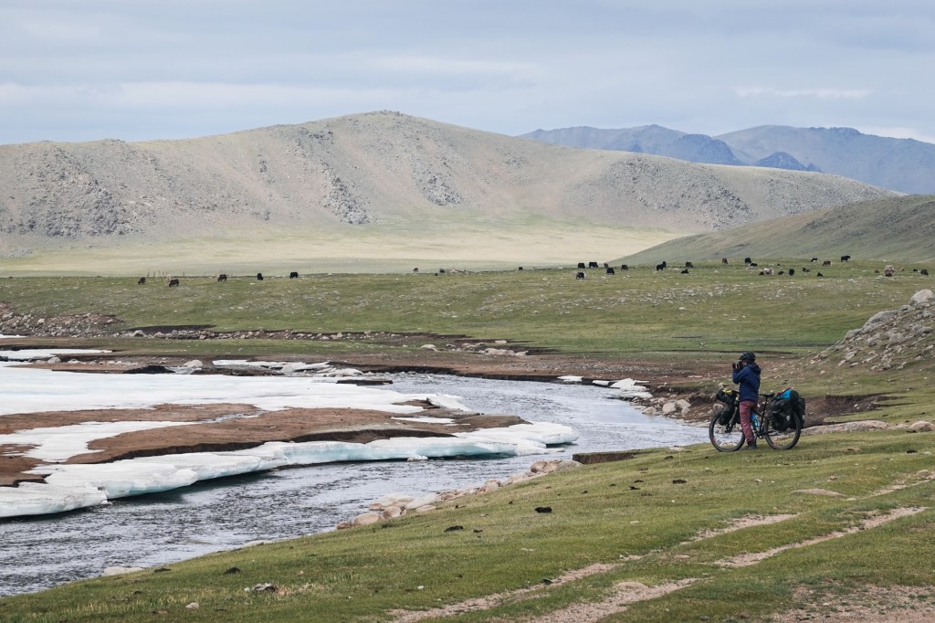 Wake up early to escape heat and wind and we are happy that a semi frozen river runs enough water to fill up our bottles. This stretch marks the longest until the next water point. We roll until 12ish easily on the paths and can see the first gers again – with 3 dogs that “greet” us. The dogs here are annoyed by bikers and will follow with angry curiosity, but they are friendly compared to shepherd dogs in other countries.