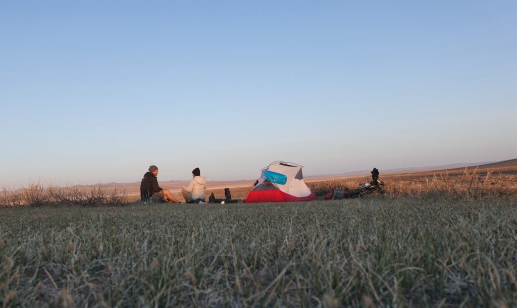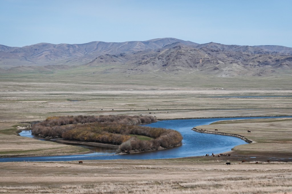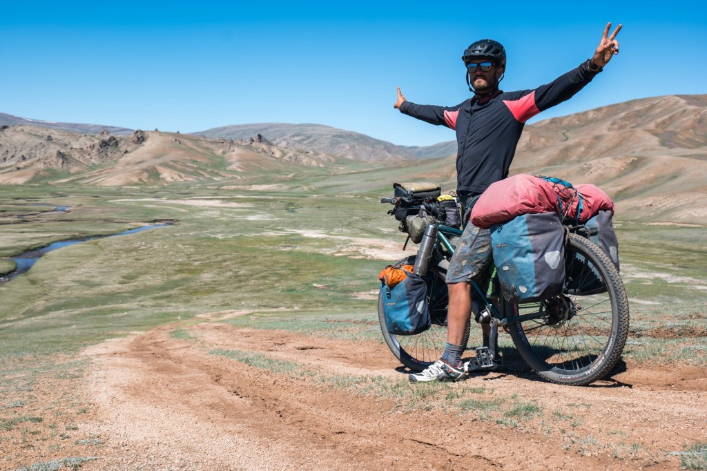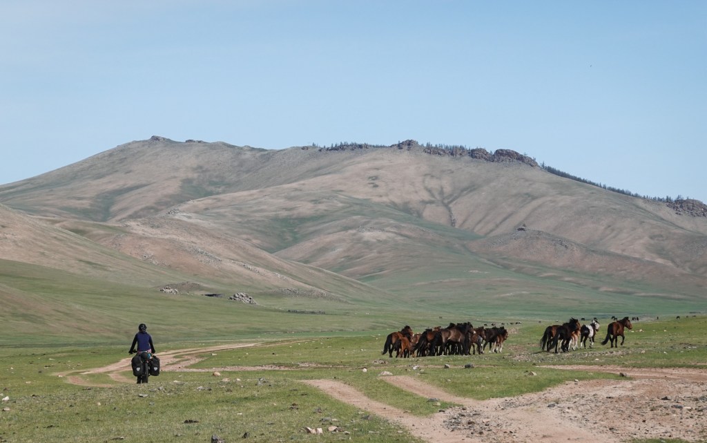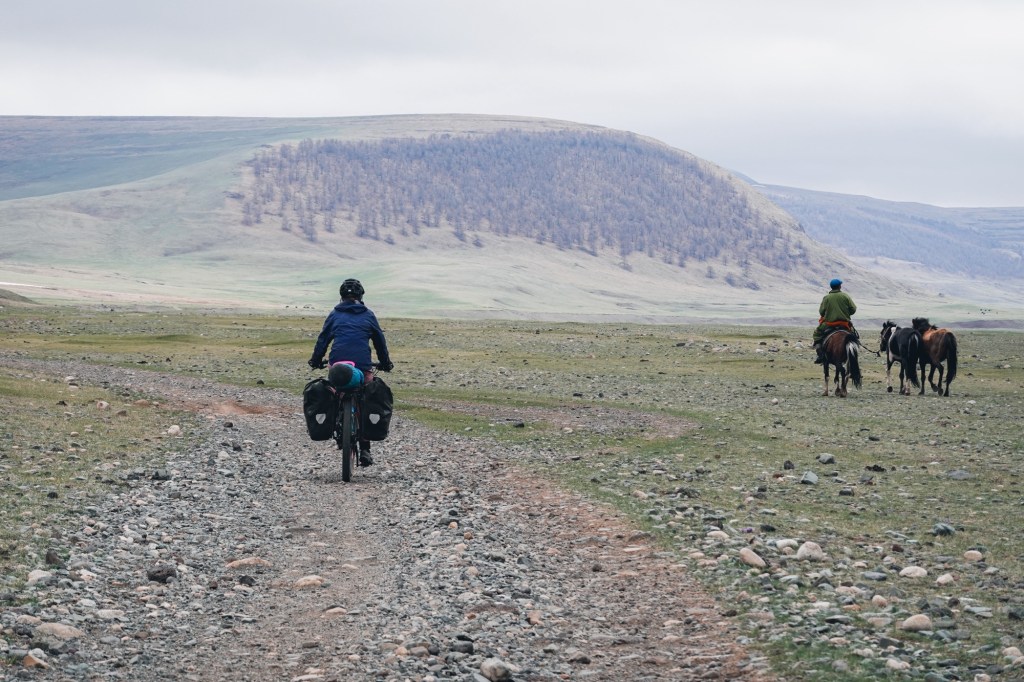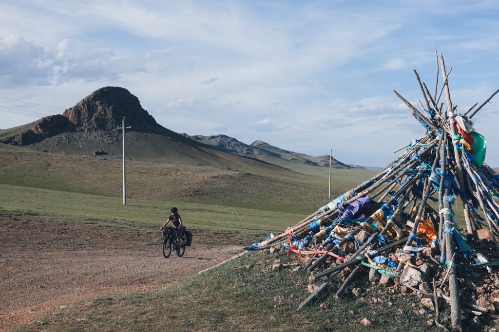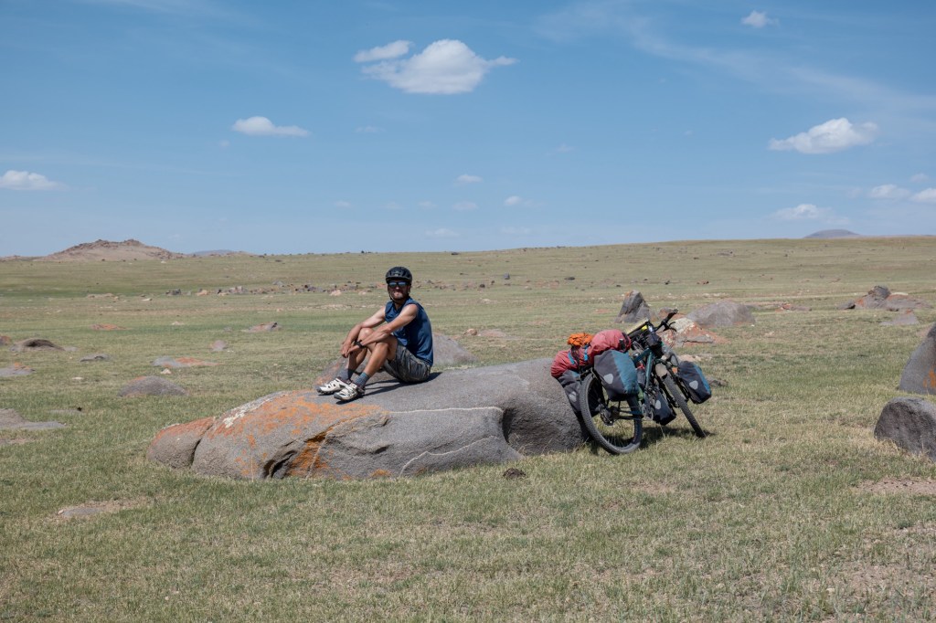 Wake up early to escape heat and wind and we are happy that a semi frozen river runs enough water to fill up our bottles. This stretch marks the longest until the next water point. We roll until 12ish easily on the paths and can see the first gers again – with 3 dogs that “greet” us. The dogs here are annoyed by bikers and will follow with angry curiosity, but they are friendly compared to shepherd dogs in other countries.