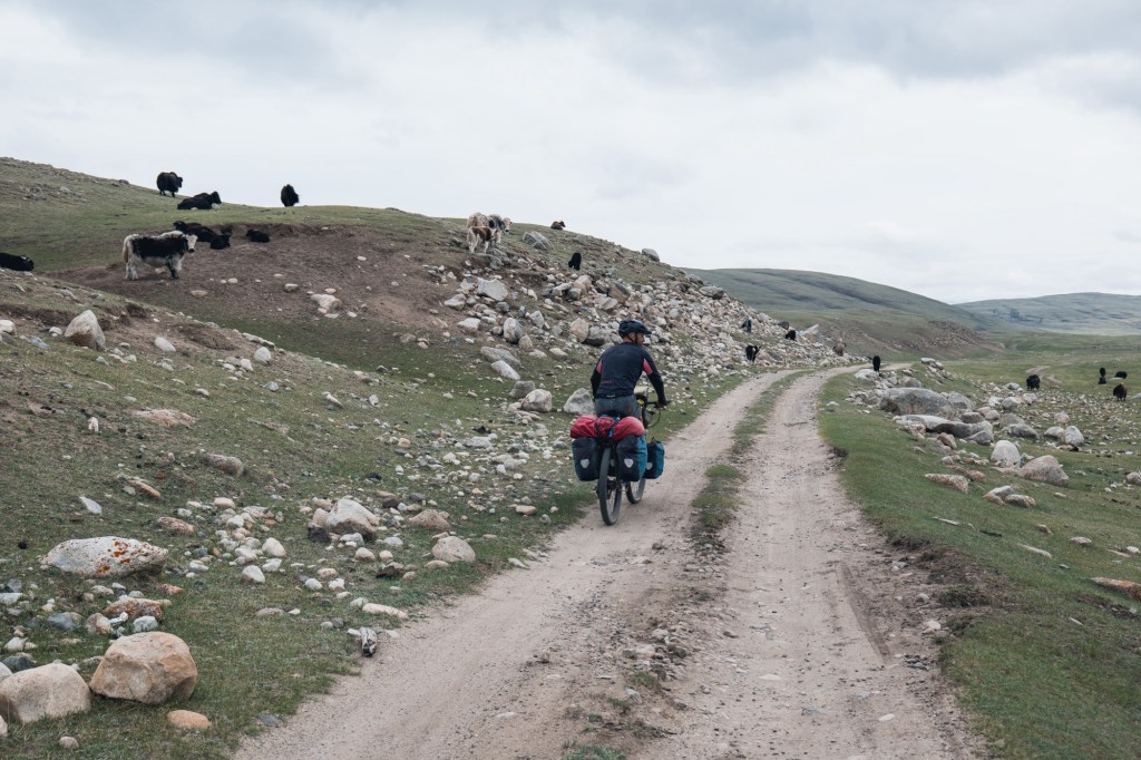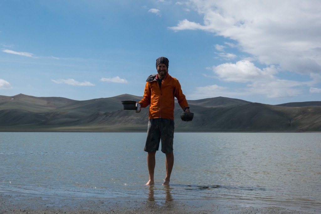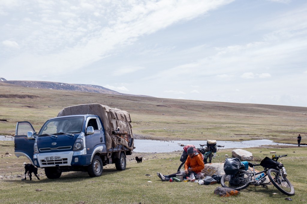 Two more passes and the landscape gets lonlier, dryer and we don’t see horses or gers anymore. Dinner time in the probably remotest part so far. We prep our special finding of today: potatoes and cabbage!