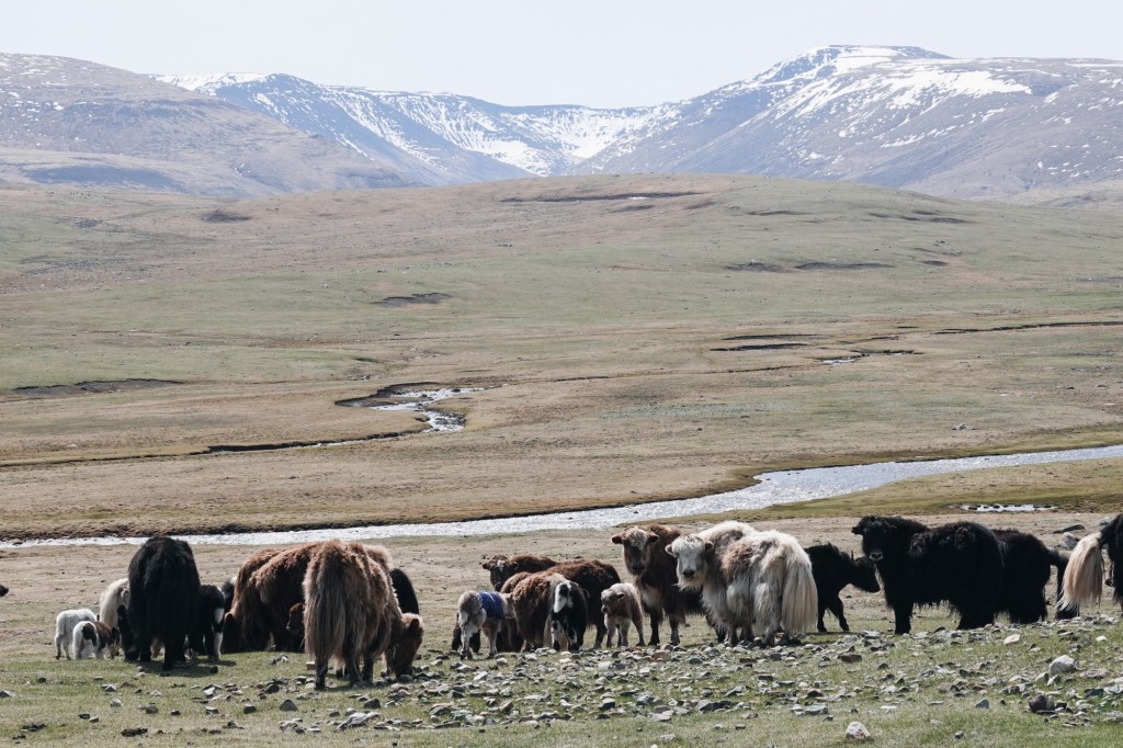 We stop at river for a break, mentally prepping for the crossing as a truck comes pass the river. Impressive how these vehicles and the drivers ride these roads. He stops to fix some issues on the vehicle and to let the truck cool down. Out of the passenger seat comes cute puppy and freshly born yak standing woobly on its feet going rounds across the truck trying to feed on various parts of the car. Over the past days we saw a handful of trucks that appear to be setting up gers for summer.