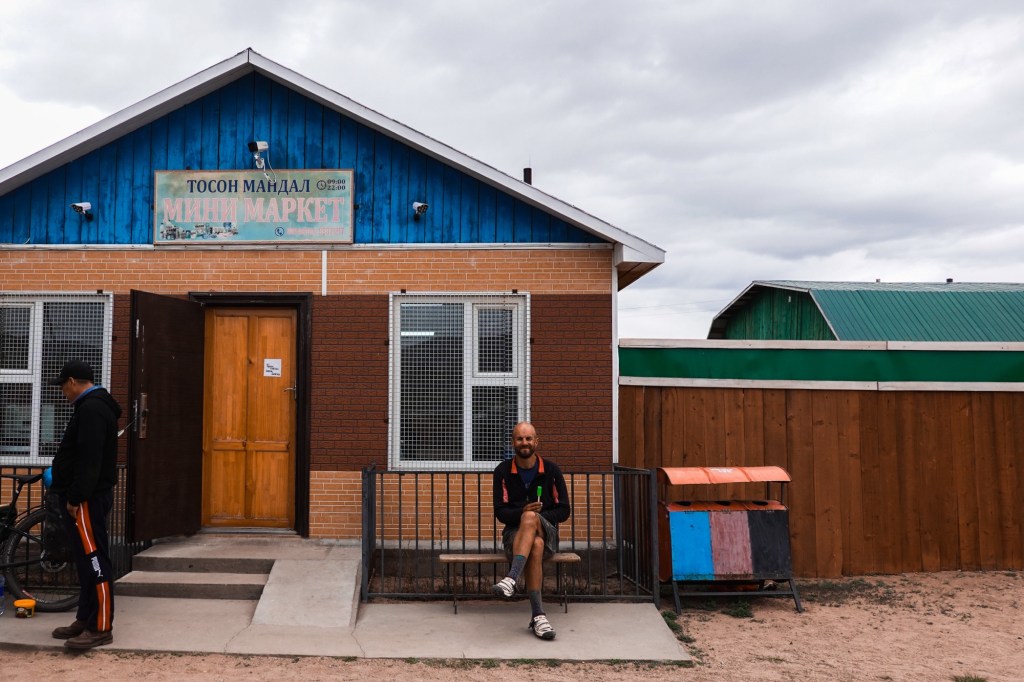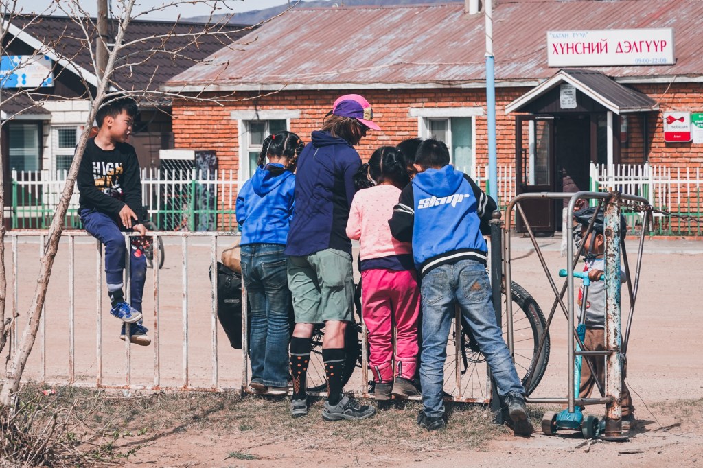 We dry the tent for a bit and decide to first ride one or two hours before we eat breakfast. We head towards the first little town to resupply – Öndörshireet. The shops have a good arrangement and we eat at a playground accompanied by 5-10 kids curious about the map, the bikes and us. The boys were wrestling around us, driving the bikes till they break, the girls where sitting quiet next to us occasionally smiling. Ralf fixes the derailleurs of one of the bike, Julia puts the chain back on another one, so that they can race us out of the city.