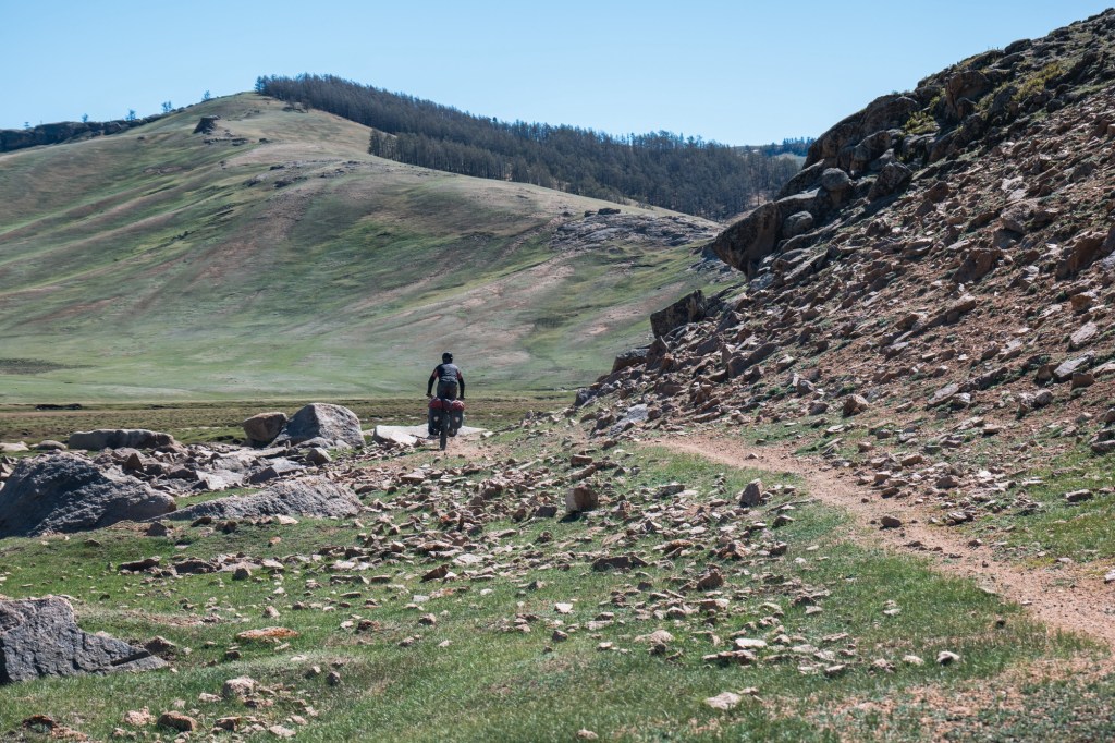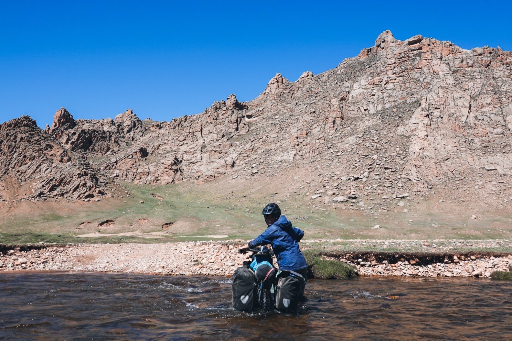 We head further towards Otgon, cross into the Zavkhan aimag over another pass and a quite fun downhill until the roads get flatter, washboardier and the wind picks up speed. Refuel in Otgon and we search for a campground. After Otgon we have two roads to choose – one is the “main road” towards Uliastai, which we found on other bikepacking blogs and the other one a village road into the mountains (a small shortcut with the high potential to be gorgeous but also with the uncertainty that the roads might lead to nowhere). We decide for the safer option in the evening and so we start on the 5 lane dirt-road towards Uliastai the next day. At the crossroad peaking into the mountainous we spontaneously take a turn towards the second option, crossing an icy river to join the other path through the mountains – time to explore a bit and happy to be away from a washboard road. This soon turns out to be the best choice so far. What follows is the best day and route we had until now.
