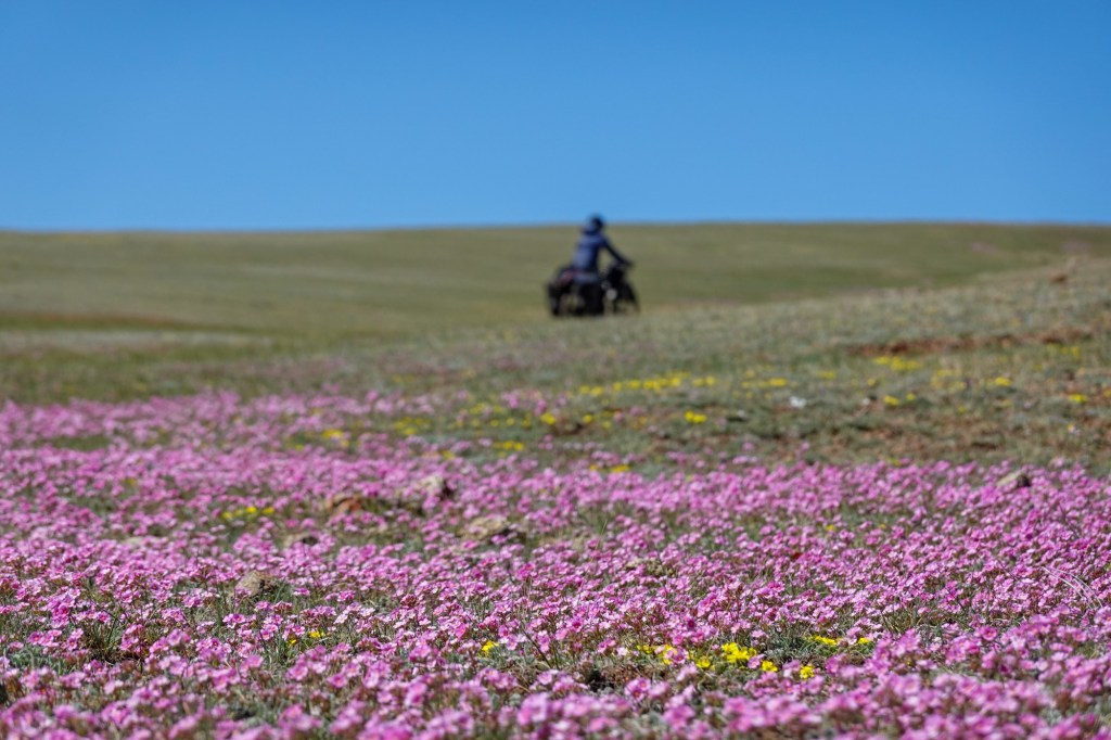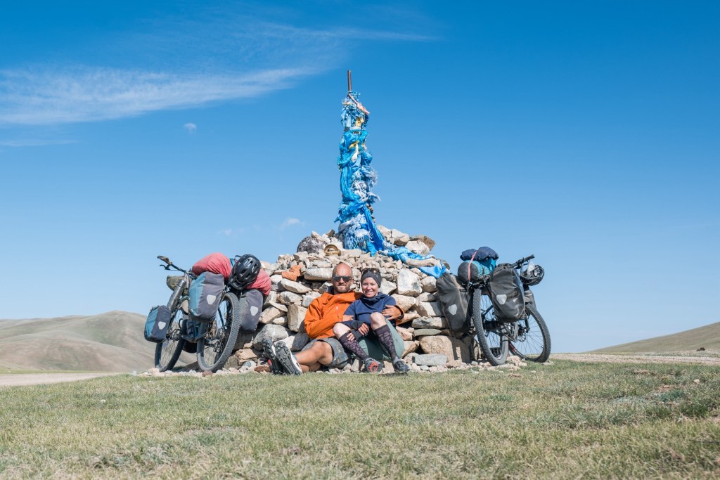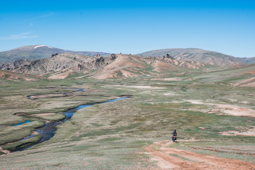 We follow fun motorcycles single trails with view on Otgon Tenger Uul – the sacred mountain of the Mongolians with an altitude of 4029meters. Steep uphills await us, fun downhills and so it goes the entire morning. Puffing our lungs out on the short but oh so steep uphills – but simply happy to be away from the washboard-wind combo.
