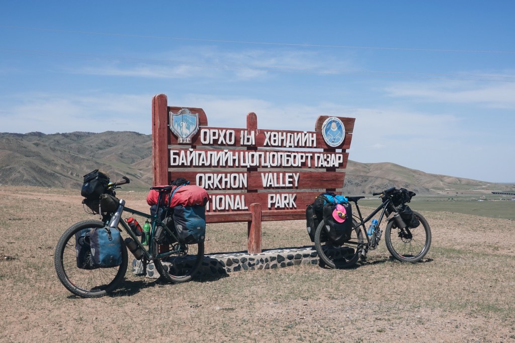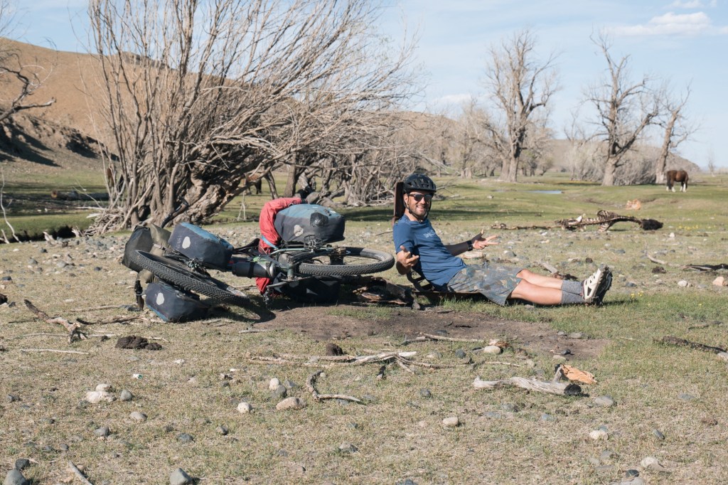 Us – we will head into Orkhon Valley towards a village that could easily be confused with a german town namely Bat Ulzii (ger: Bat-ölzii > “Bad[T]ölzi”, haha). The valley lies on the crossroads for trade and has archaeological sites that date back to the 6th century. Half a day spent under a tree and Julias stomach is getting better again and finally feeling stronger and ready to explore with full energy. The valley is grazed by herds and plays an important role for the nomadic people as well as tourism development. The paths are smooth rideable and go along side of the river. One unplanned detour lead to a not so smooth river crossing and Julia getting cemented in the mud together with her bike.