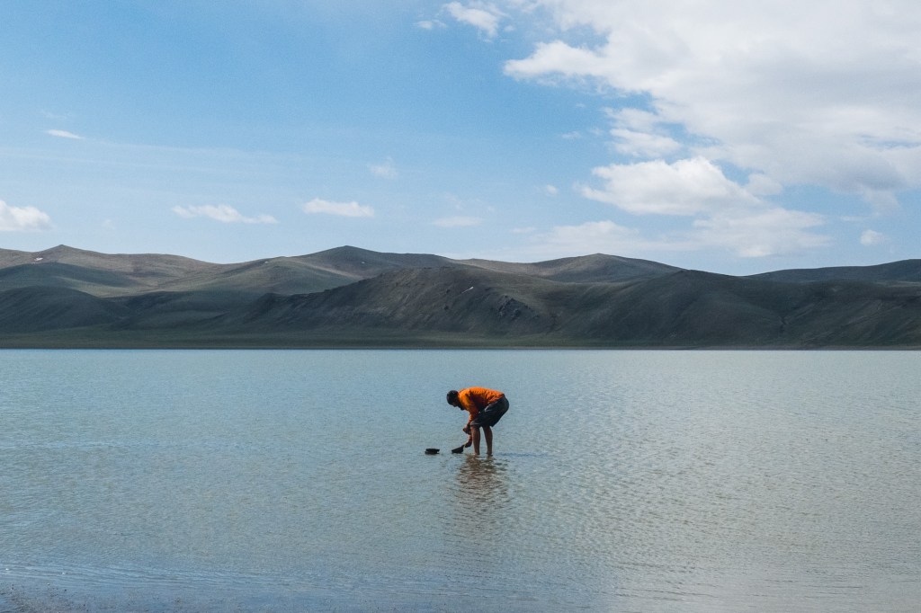 The next pass awaits, which will mark the highest point so far with 2700. An easy gravel road leads towards the pass and we can see from above the Sangiin dalai nuur lake which we had choosen as a break spot. The lake is quite empty and so we ride on the dried ground towards the shore. Feels good to be close to water in the otherwise so dry area.