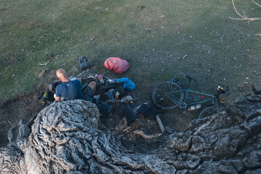 We follow the path and camp under an old tree next to a river. What a magical campsite! The countryside is so sparsely populated so camping is absolutely necessary here but also it feels like the area is a campers paradise. Always minding the “leave no trace” mindset, you may have to carry your trash over some passes before the next little town appears. In the morning we find a bumblebee sleeping in hole of the tree – right above Julias Bike which is named: Alpenhummel (Bombus Alpinus).