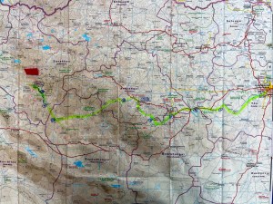 With strong headwind we follow the first 20km on semi tarmac, a road – under construction- where it feels like in a sandstorm with the cars come rushing by.