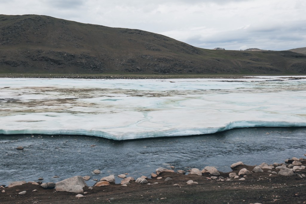 We leave the Chuluut river (stony river translated) behind go over some hills and follow another valley that will lead to the highest point so far of 2500 meters of altitude. Just as we enter the new valley we see a huge ice layer on the river. The surface of the ice shimmers in various colours and we remember everyone telling us: “its not august or july yet it is THE may!”