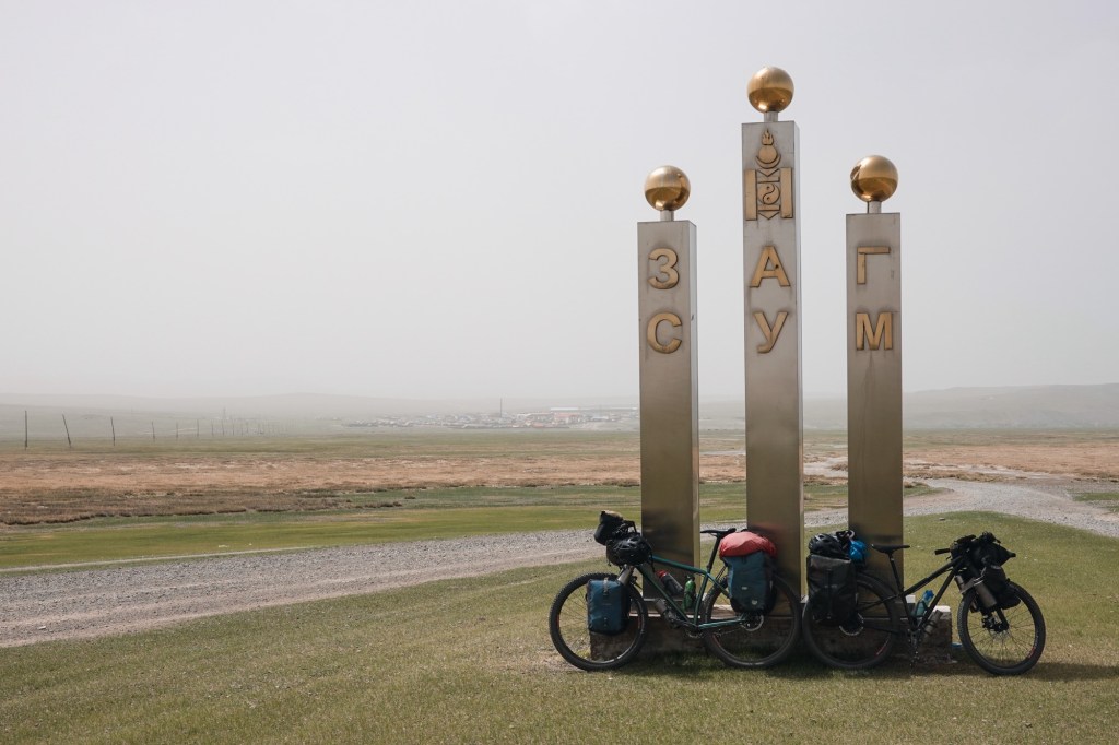 After 50km we arrive at Altanbulag which lies in the Töv province (“provinces are called aimags”) where we stop at little pavilion for some premium snacking (bread, olive oil, salt, cucmber) and some melted Zotter Nougat. Altanbulag marks the end of tarmac and we head towards the west on sandy paths still pretty easy to ride. The first drift in the sand feels a bit woobly with the weight on the handlebars but soon getting the hang of it. First washboard sections waking us up again. Feels great to be in the wide open, away from the asphalt, riding amongs horses and sheep and endless sand. In the distance we see a mountain range.