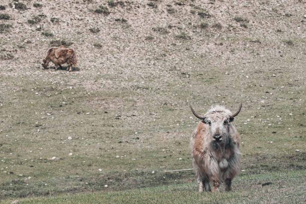 Last day until the first restday at a guesthouse in Tsesterleg (the capital of this Aimag). We ride against the wind over two passes, scared off some herds of horses and yaks. Its funny to watch how they react to the potential “threat”: us cyclists. The horses are usually overly excited, quickly sprint with elegance and flowing mane in one direction to just stop again and look curiously towards us. The foals seek shelter close to their mothers. While the yaks stand up moderately, look at you with a mix of indifference and fierceness ready to take a headbump towards you. Some especially the younger yaks hop away, somehow looking like dogs playfully jumping over the grass. The really fresh calves are super playful chasing each other gleefully.