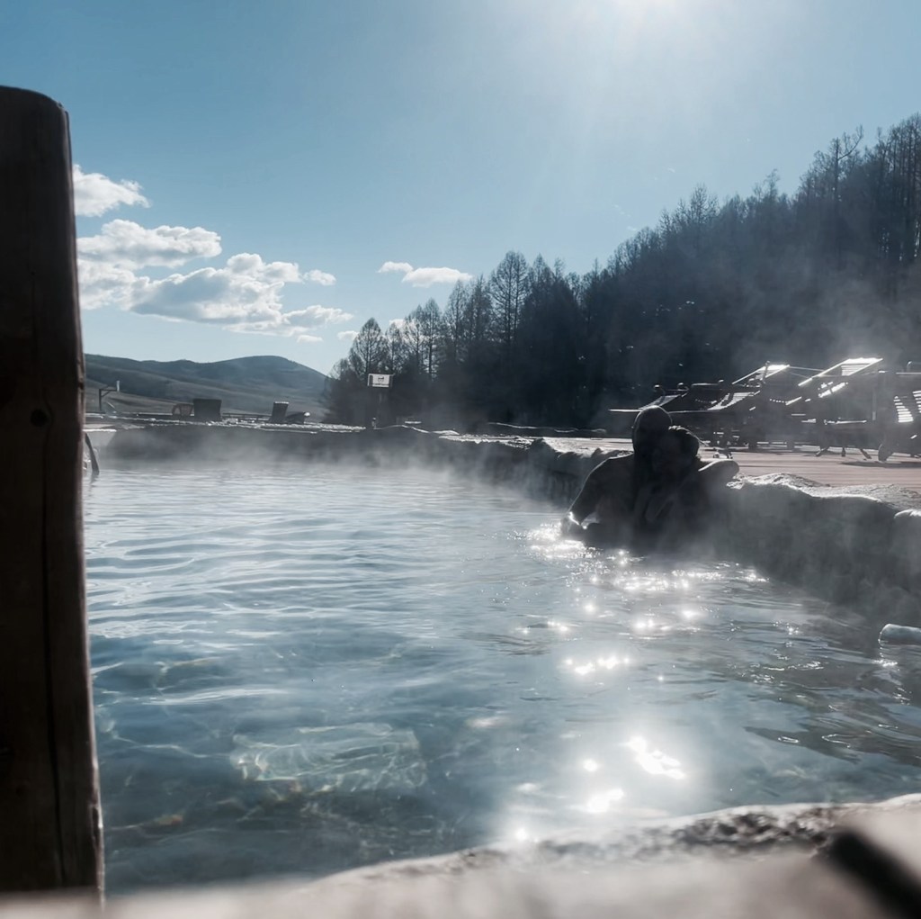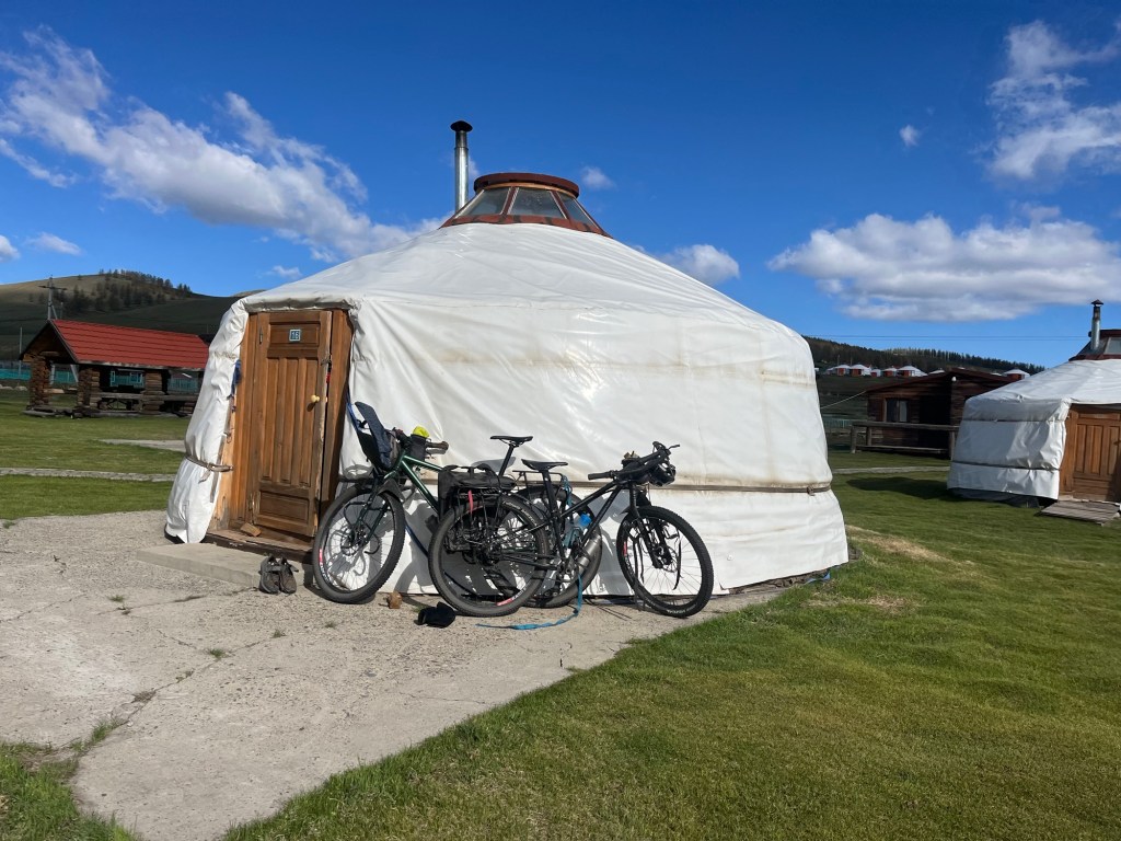 With tailwind the riding feels smooth and we gain some easy kilometers heading into the Arkhangai-Aimag (referring to North of mountainrange Khangai) and towards our next destination: natural hot springs at Tsenkher! The next day the wind turned against us making us work for the relaxation. After some river crossings, steep passes seemingly going in a straight line up the dirt roads, wind from all sides and being hailed on – we arrive in the evening at the hot springs. Its early in the season so most of the places are still closed and/ or currently in the process of renovation. Leaving us with the only option of a slighty overprized place and our first night in a ubercomfy ger. The water that is coming out of the hotsprings is about 80degrees and one of the pools is unbearable hot. Another one feels comfy especially after getting stuck in the hail earlier that day. We chat with some guys from UB and some germans that are here for the weekend.