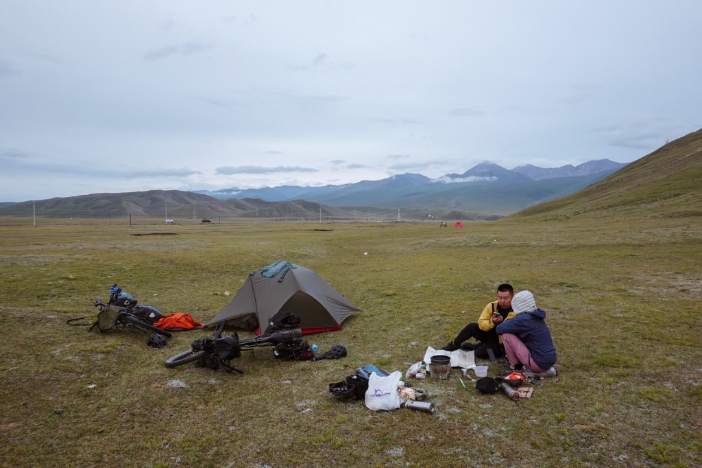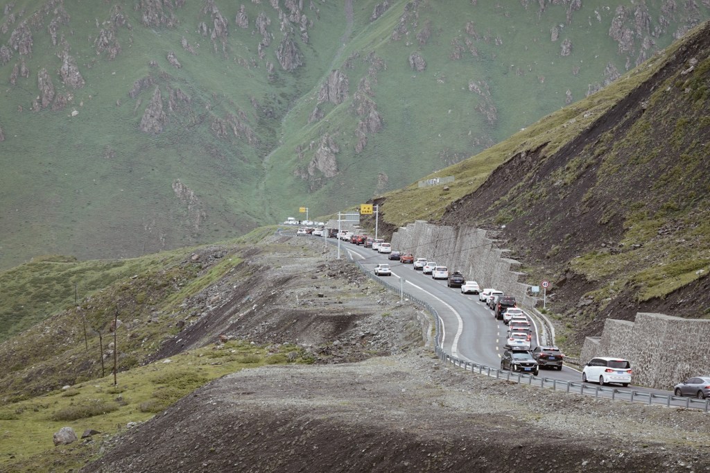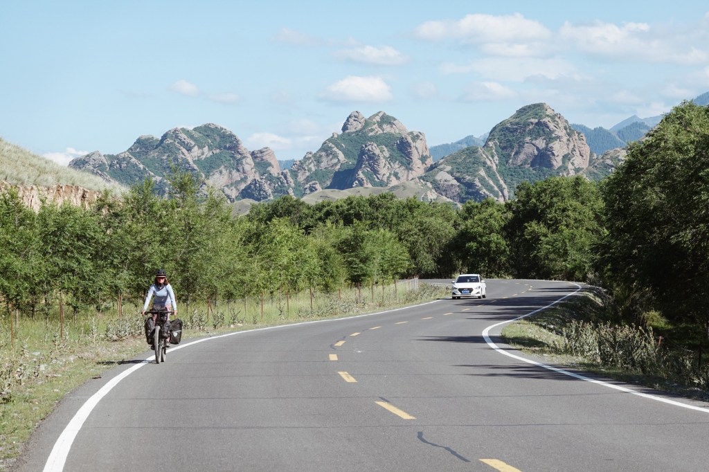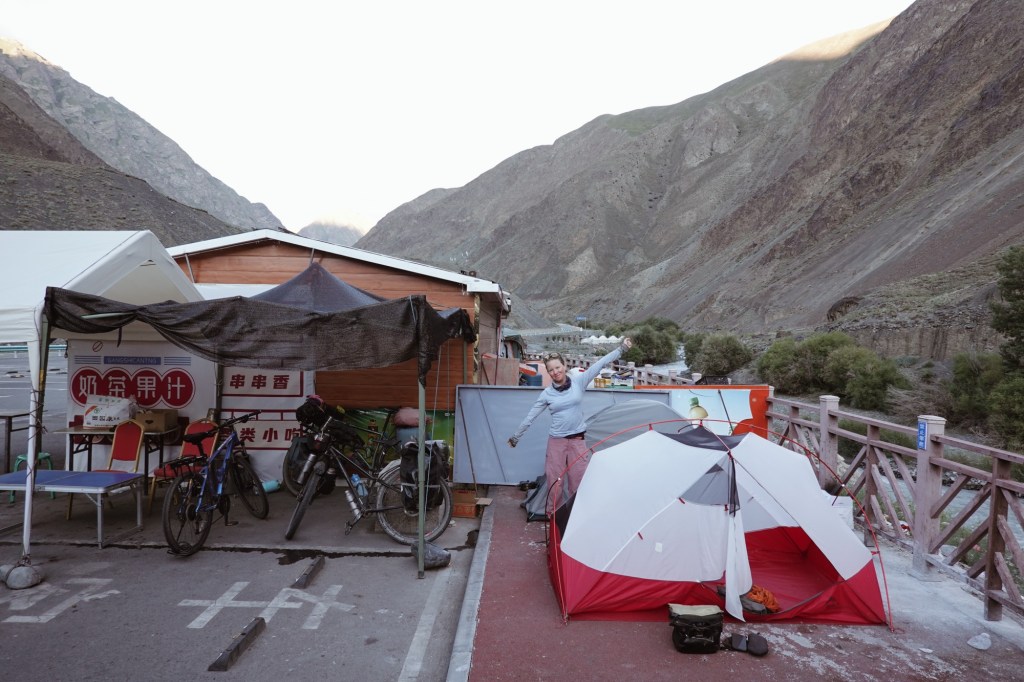 We drive a few kilometres on the S101 a scenic road at the foot of the mountains with amazing landscapes. The next day we encounter one more roadblock and we head back into the valley with disappointment. After the unplanned detours we take the western most road to cross the mountains and follow the „most beautiful road“ of China (the G217) which indeed was spectacular winding through canyons, meadows and via 3000 meter passes – leading towards the way where we were supposed to head to further in the east. Spectacular, yet, overcrowded with cars and we experience a few very uncomfortable passing and overtaking manoeuvres. It was the start of the holiday season in China and so many local tourists roamed to the region to rent SUVs or Jeeps. On the bright side we meet a lot of local cyclists – apparently it is a big thing to conquer this road 🙂 who knew! Gladly we share a camp-spot with a local cyclist.