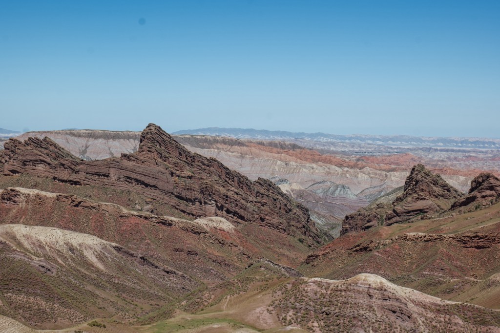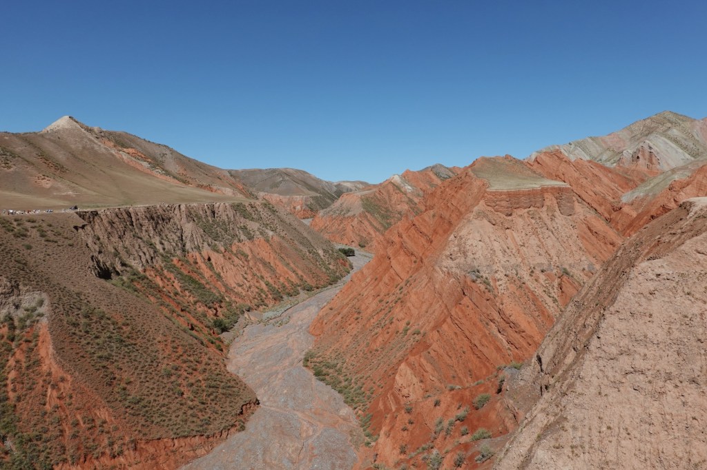 Our goal is Kuqa, what used to be important city along the silk road. We shall encounter one more road block for foreign tourists – as we head in that direction. On this section the options are going back 400km (but there would not be any other option heading south we haven’t tried) or cross the border into Kazachstan. With the explanation that police in the other county specifically directed us to this route and having no alternative the officer told us to wear our buffs and pretend to be local cyclist. The scenery on this route was amazing, however as we knew we should not be here we tried to pass the county as quick as possible. Just before reaching our next break day (having crossed into a different county) we visit a tourist highlight along that way – the Red Canyon. We camp out in the parking lot of the entrance, blending in with many local tourists.