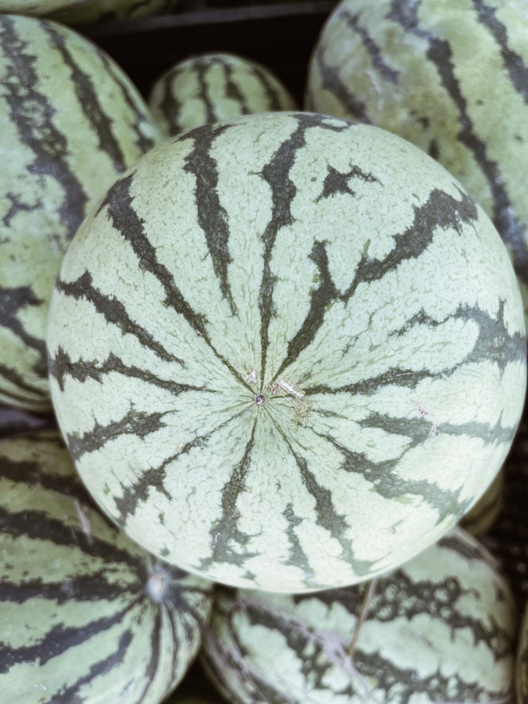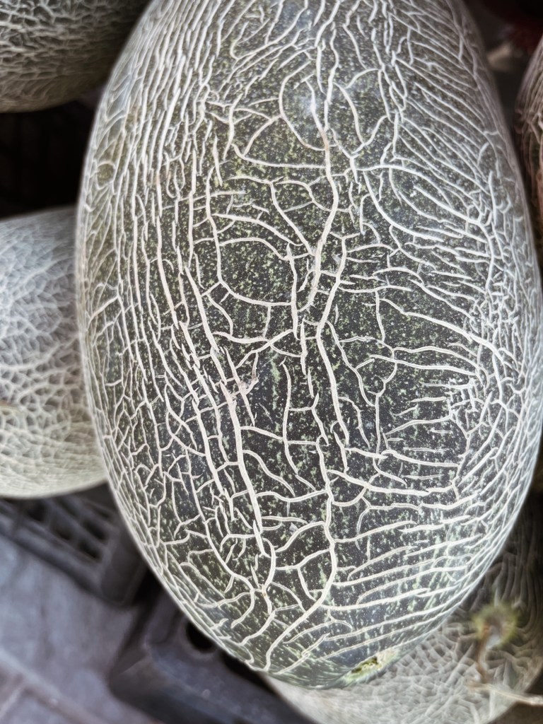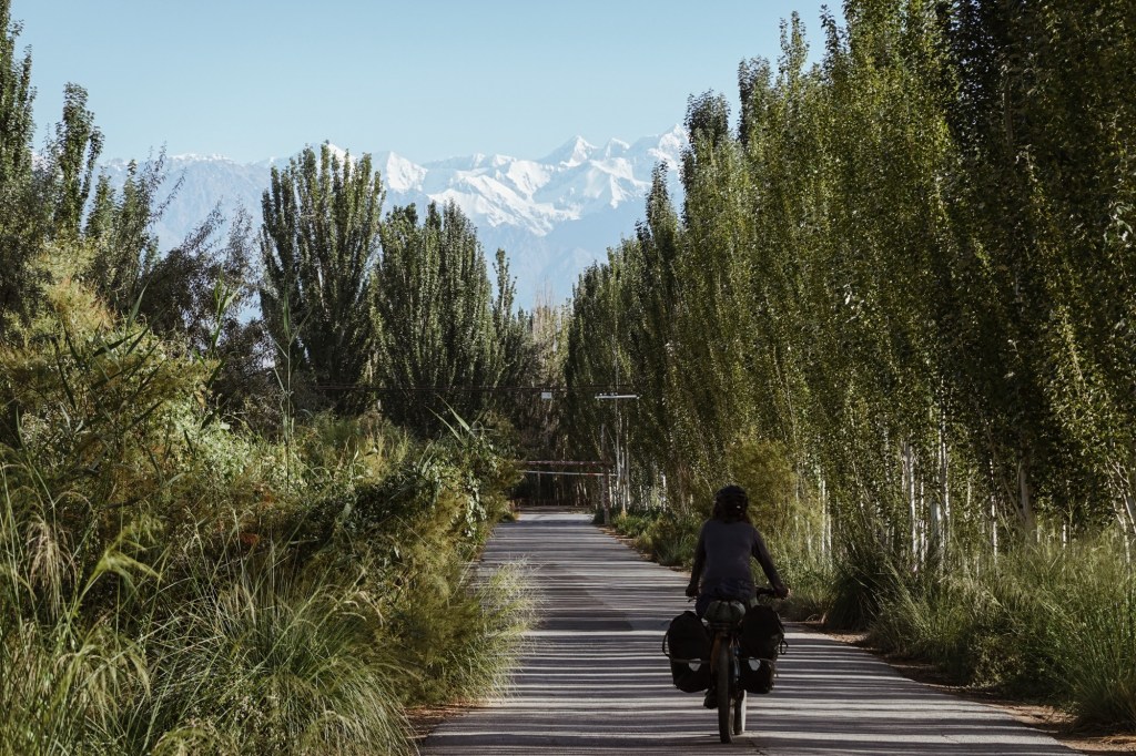 So far so good, we head further west – with the usual headwinds. From here on it we will switch gravel, washboard and mud for steaming asphalt roads. The following days we decide to ride as fast as it goes to Urumqi from where on we plan to head towards the Tian Shan Mountains. Long days are ahead of us in a hot and arid landscapes and wherever we would stop, for buying drinks or taking a break we could be sure that a couple minutes later police would pass by for the usual passport check, questions about routing and intention of travelling – everything recorded on phones or a bodycam. Very friendly and often we are gifted water or chilled drinks. With the heat and the fences in the open landscapes the cities become our oases. A paradox for the both of us. The perfectly shaped city parks with sprinklers provide shade and anonymity during the long days. Along the roads the small shops and restaurants often have lovely gardens. Tomatoes, cucumbers, pumpkins and of course melons decorated the entrances of the shops. Around 600 km, many, many melons later we arrive in the capital.