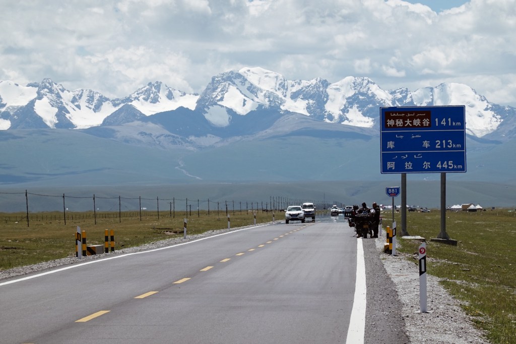 What followed was a rather confusing experience of checkpoints, stops, road closures and redirections. Trying to reach and cross the Tian Shan Mountain Range we experienced many road closures, got turned back on 3 (almost 4) cross sections / passes that lead over the mountains. The chinese whispers with different county police has started as we leave Urumqi. One district advises us a different route which then again is closed or not „suitable for cyclists“ upon arrival.