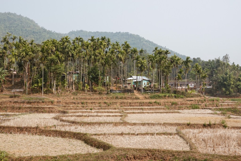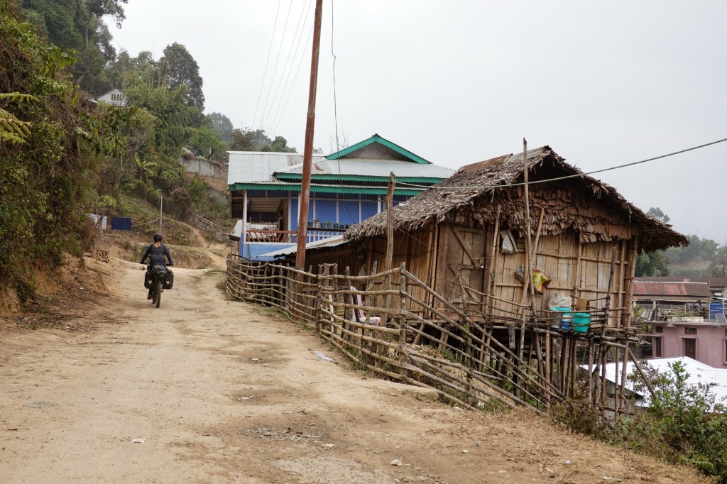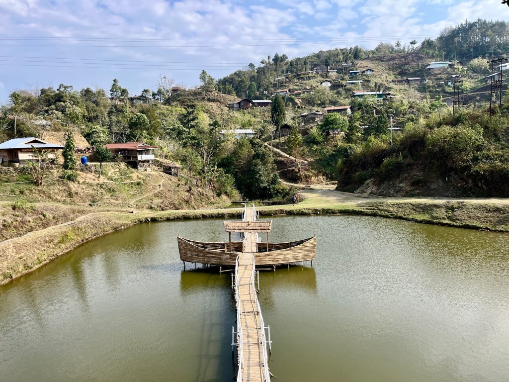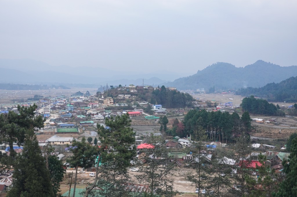 …. Happy to arrive in Ziro, we find a place where we can eat Dosas and a nice little cafe. Rain drizzles over the busy town. Honestly we didn’t expect Ziro to be that big. But our homestay is a in old Ziro, in a quiet area. New houses mixed with old traditional bamboo huts. Our host gives us a tour through the village and we ride to the lake and a viewpoint.