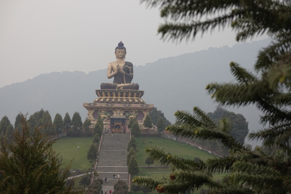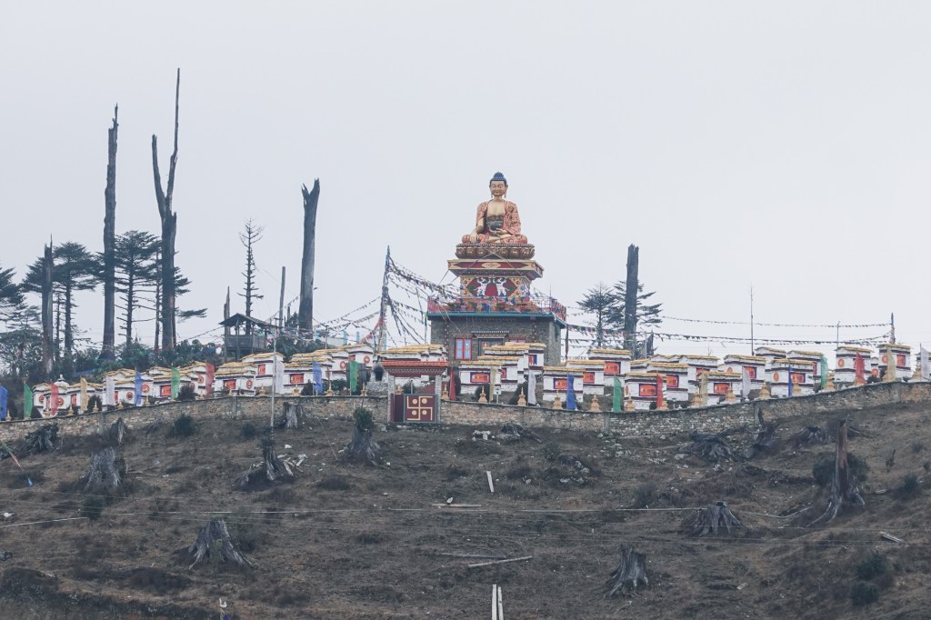 Path The next day we pass 3000 altitude meters and touch the first snow. At Mandala Pass a giant Buddha statue sits enthroned over the little settlement. Mystic, black trees sting through the grey and thick air.
