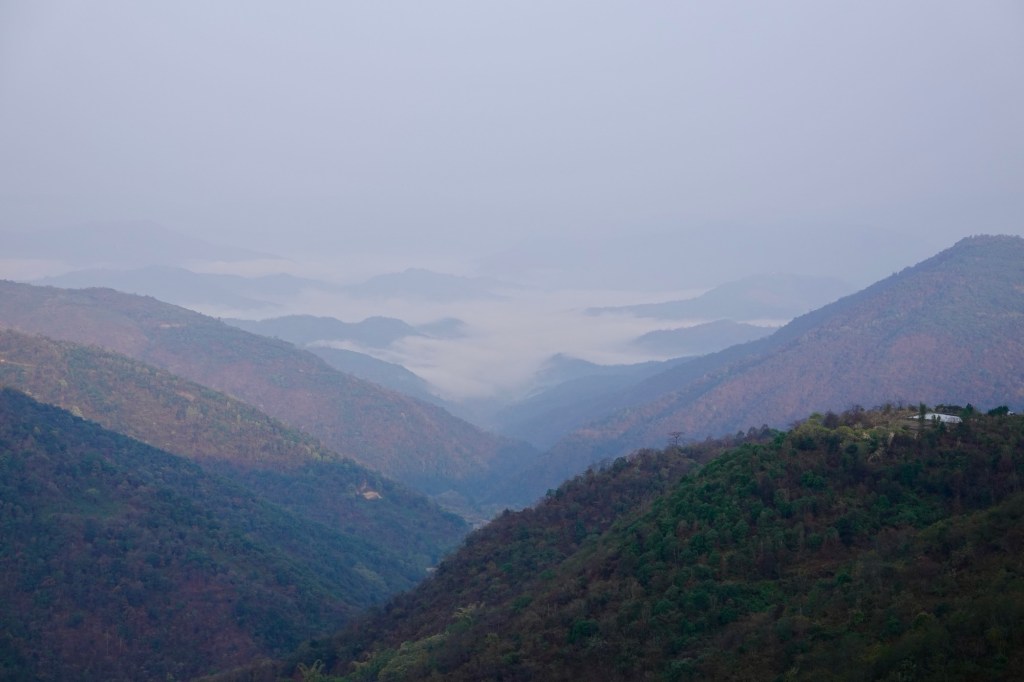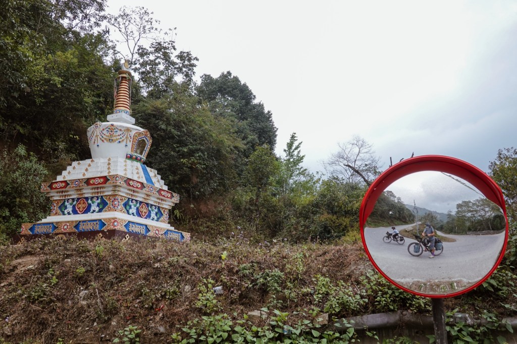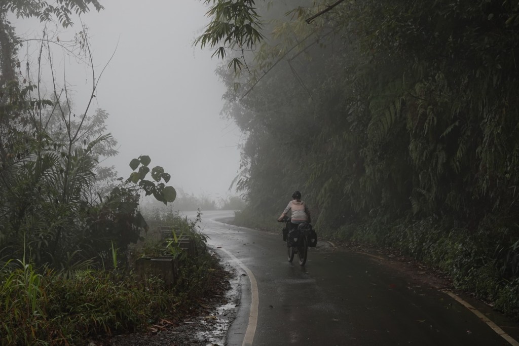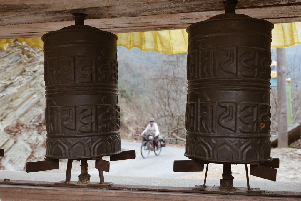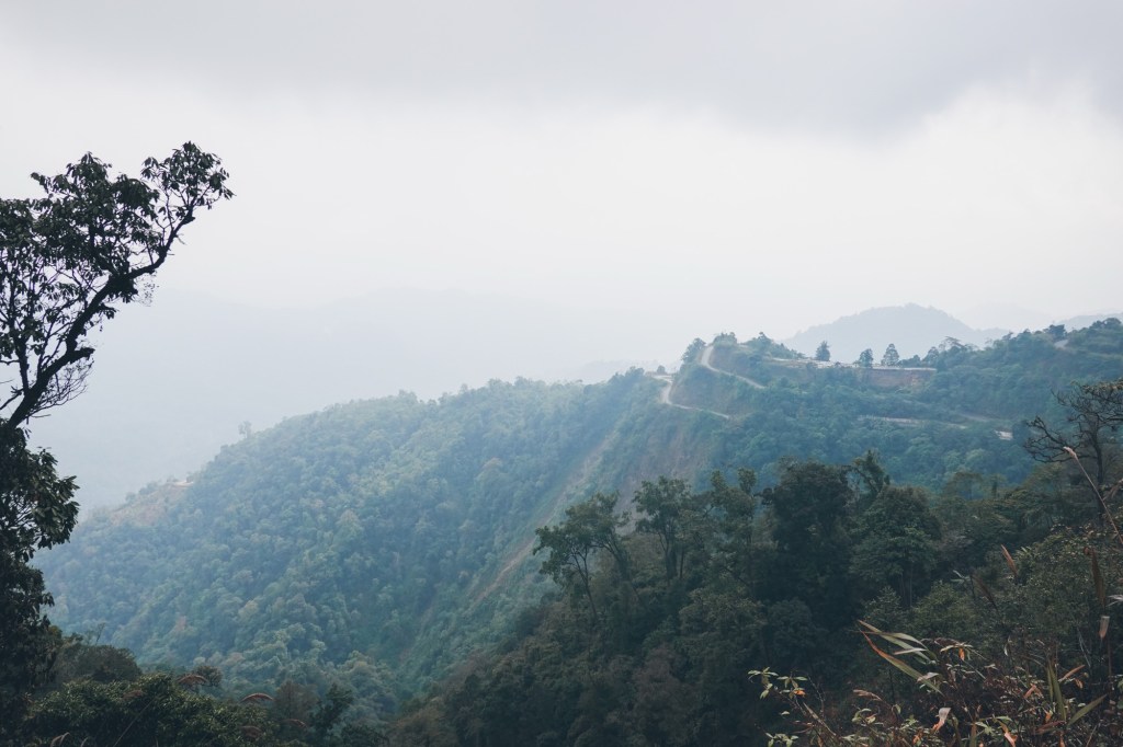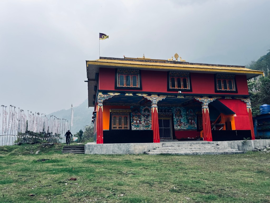 Many more switchbacks curl over the hills. Up and down, pass by small villages and monasteries. Prayer flags swaying in the wind. The air is humid and misty. Everything feels calm and peaceful.