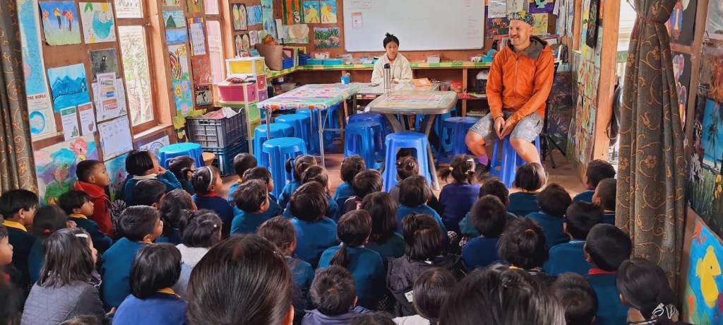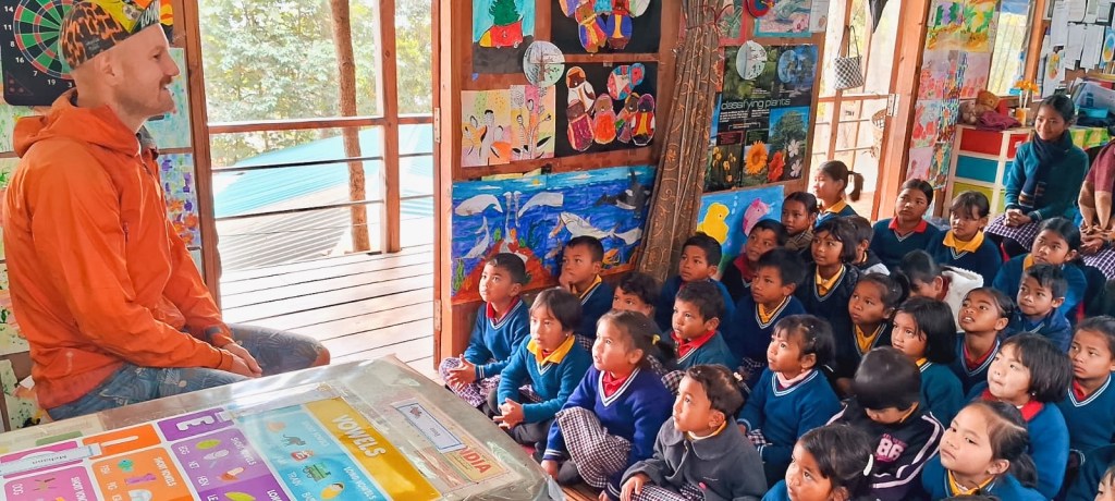 Fishing During another warm-showers stay (platform like couch surfing for touring cyclists) he gets to know a local school and the students. The school was built by an australian missionary couple. The couple is not living in India anymore but touring cyclists can stay at their little wooden house/school. In the morning one teacher organises a little meet and greet with the students and then they can ask some questions to Rolfi.