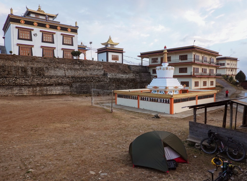 When on our prior selected flat camp spot on the ridge of the mountain a monastery appears, we got invited to camp on the soccer field as well as for dinner and breakfast.