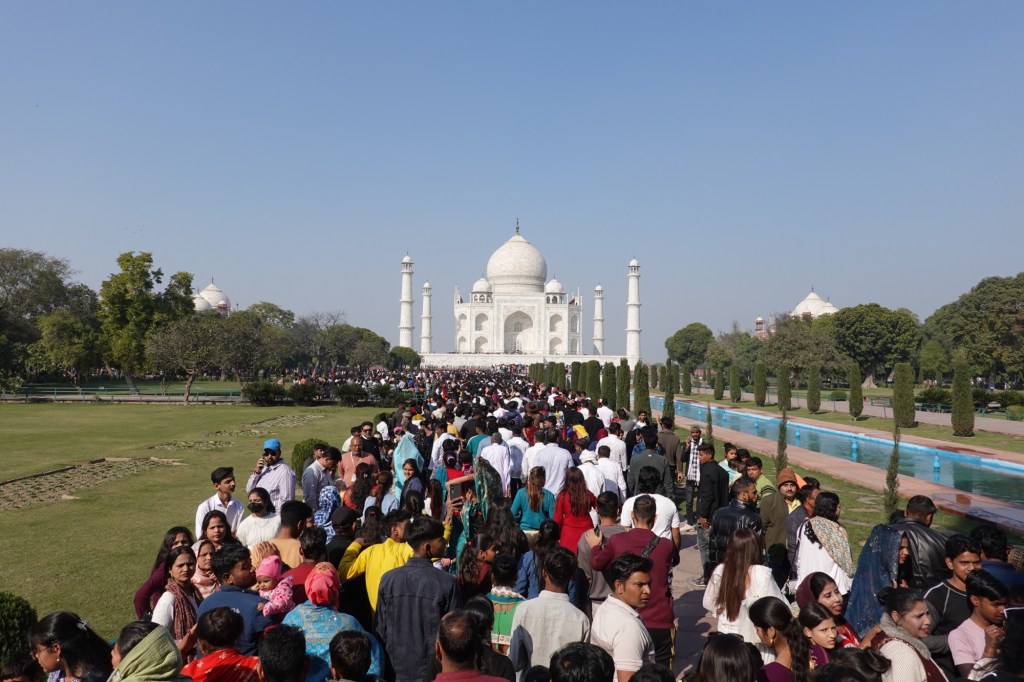 Taj Mahal from the distance As well as the mighty Taj Mahal. Little did we know that it was the day of free entrance at the Taj Mahal and so this day was a truly overwhelming and a unique experience. Huge lines, kids being lifted over barriers and fences, lots of pushing but also lots of smiles and some selfies.