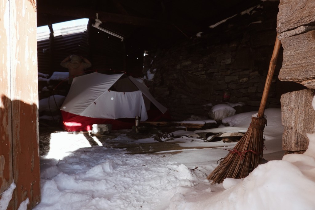 Switchbacks Snow, slush and ice is covering the road. Occasionally we get a glimpse of the valley. We arrive at the pass and friendly military moustaches great us. The military presence on the pass is like on the entire road quite high – and the camp is just behind the pass. On the way up Rolfi has already spotted a little cottage, which is perfect for camping and provides shelter from the angry storm. So we decide to ride back down again a few altitudes meters and set up our little camp inside the shelter.