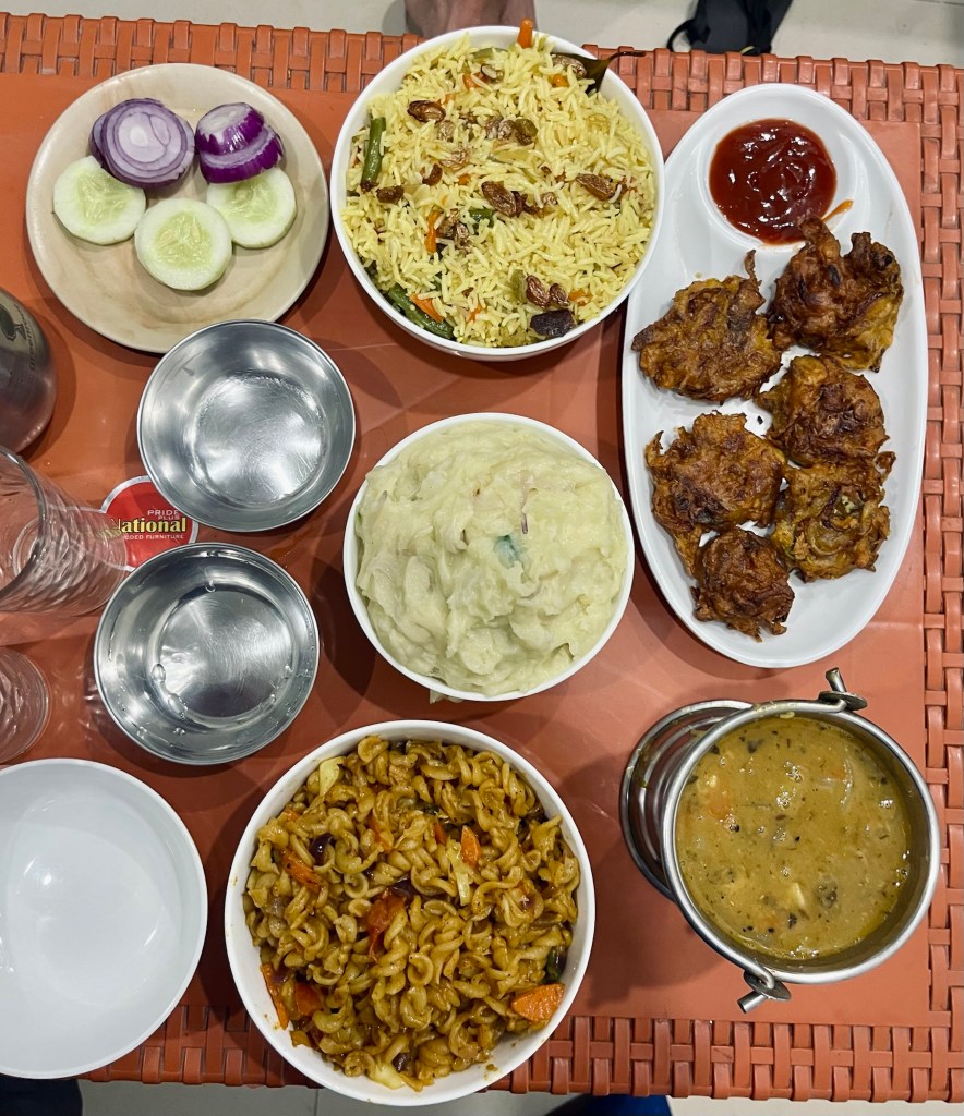 India greats us with amazing food on the rooftop of a hotel during a roaming thunderstorm, where the air is filled with the rich aromas of spices. As we savor each bite, the sky lightens up in a purple light every other minute, illuminating the clouds in a dramatic display.