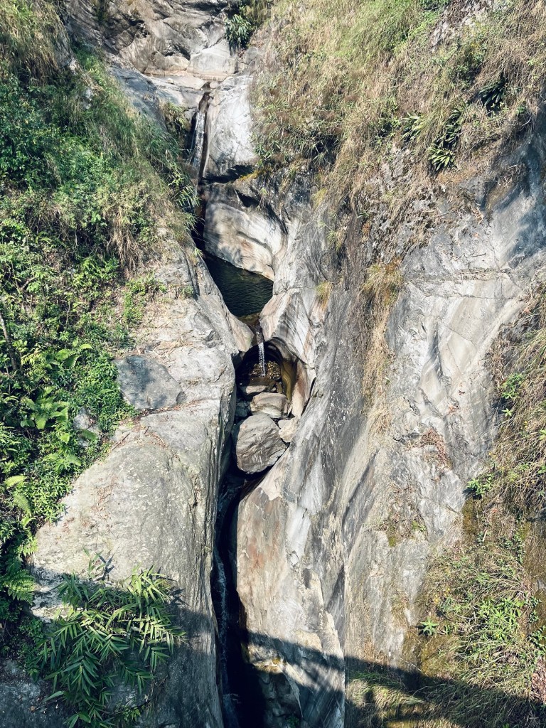 Camp We follow the Bichom river until a damm. Our trail is damaged by a huge landslide and it takes a bit of searching to find the way to the other side.