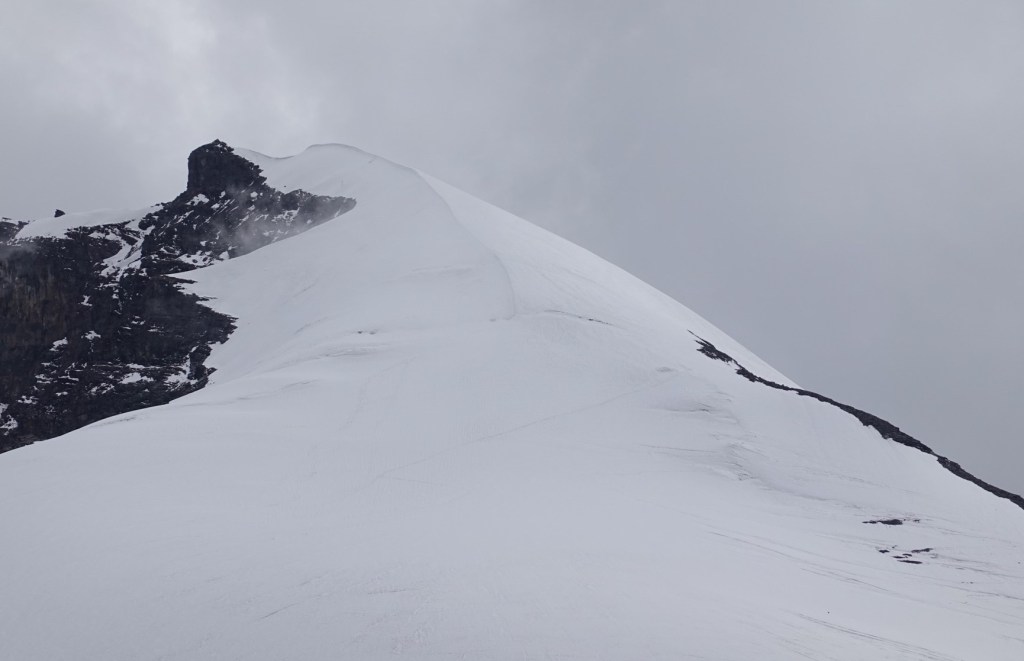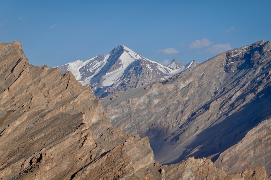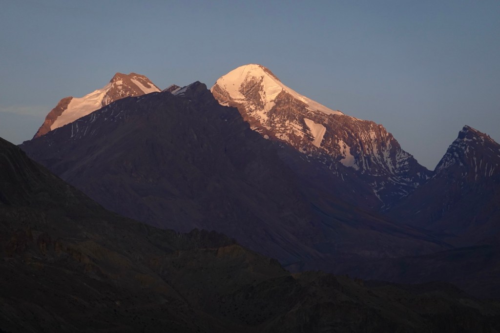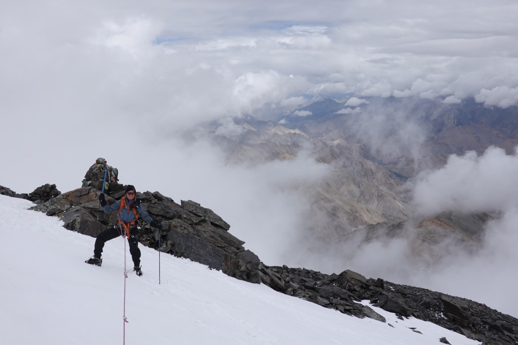 Kang Yatze II After a long day cooped up in our tent, we try our luck again the next day. After 500 altitude meters over jagged rocks, we finally reach the edge of the glacier. The route is straightforward – a steep ascent that seems to push us nearly vertical to the top. The air grows thinner as we ascend past 6000 meters, making every breath feel like a challenge. Shortly thereafter, we find ourselves at the peak.