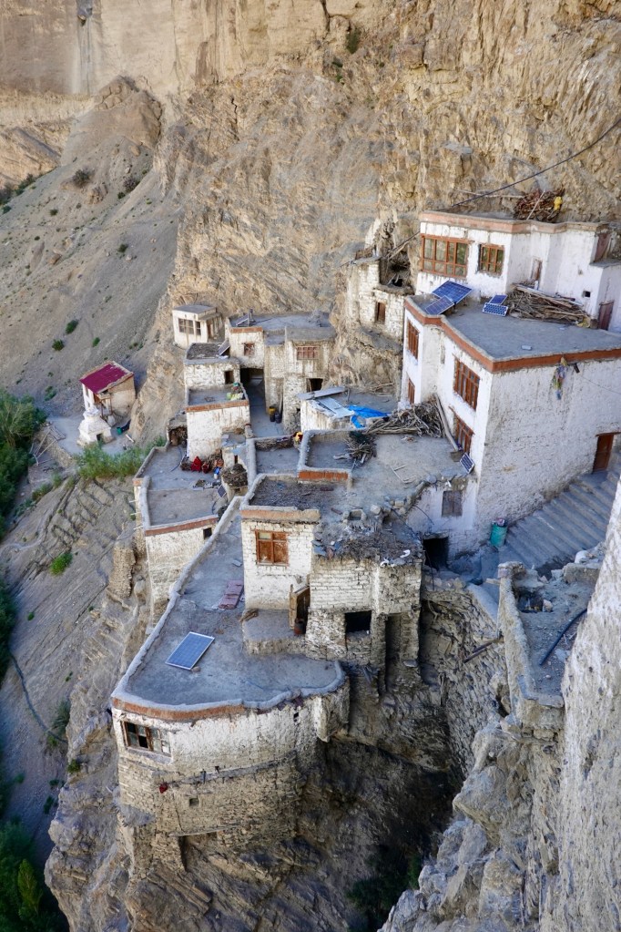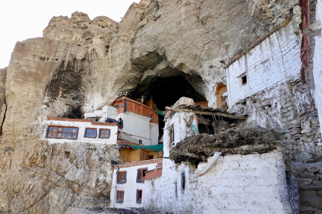 Gonbo Rangjon with tea houses In the evening, we visit the Phuktal monastery, built around an ancient meditation cave that has stood for centuries. It is believed that the cave was used 2,550 years ago as a mediation retreat. The gompa was set up in the 15th century and serves the Gelug school of Buddhism. Just few years ago it took several days of walking to get there, now we just pass by on the newly built road.