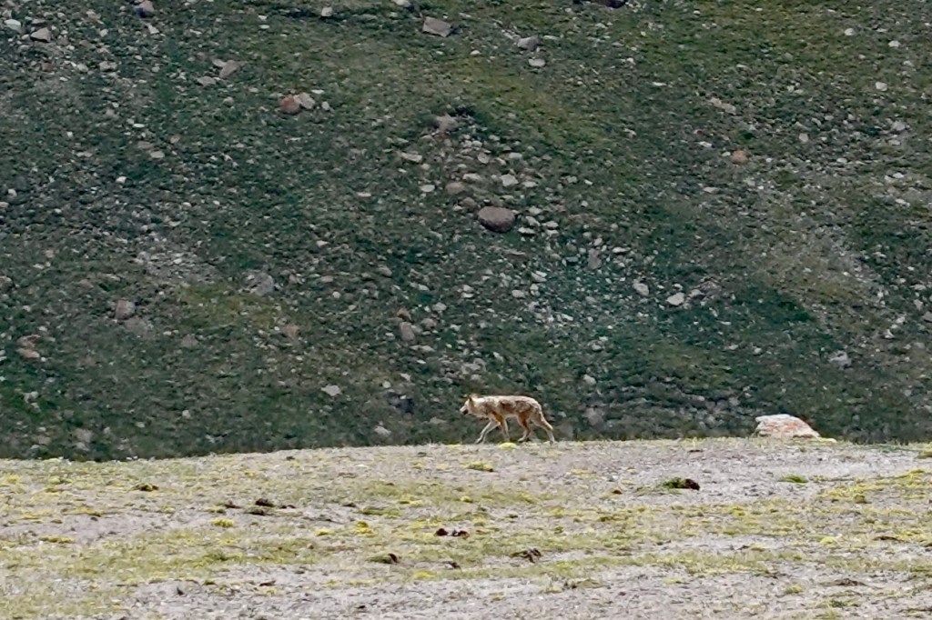A little later, we are off to the base camp of Kang Yatze II, a well known and relatively accessible peak standing at 6200 meters. On the way we spot an animal hushing via the plains – way too big for a marmot and no deer. After zooming in with the camera it turns out we spotted a wolf on 5000 meters. Just before the basecamp! What a great moment.