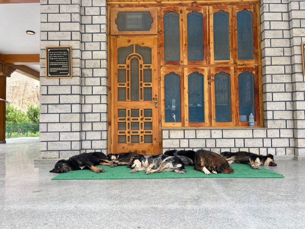 Dogs chilling at the monastery The monastery has withstood the test of time such as an earthquake, preserving its rich cultural heritage and spiritual essence, while the surrounding mountains add to its tranquil ambiance.