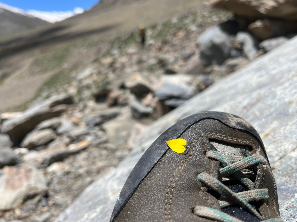 So we continue our trek via an alternative route that we have carefully chosen. Leading us through Pobe La, a little-known pass that cuts through a majestic valley filled with towering peaks over moonlike landscape before entering an alpine flower garden. The trails are not marked and vanish at some point, leaving us reliant on our GPS to navigate this unfamiliar terrain.
