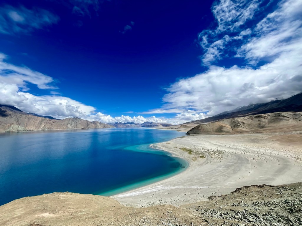 Downhill We traverse Chang La again soaring above 5000 meters. A brief stopover at carribean like Pangong Lake. China and India share the lake. Wild horses/ wild arse are roaming around its shore and a good amount of birds bath and feed in the lake.