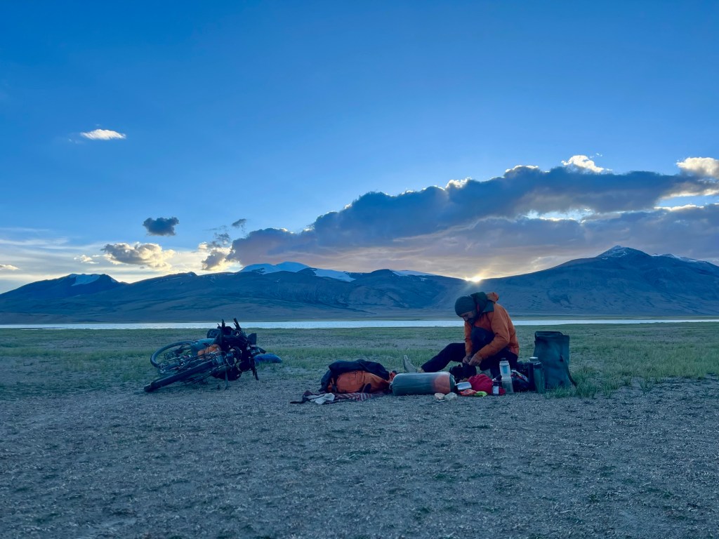 Shelter at 4000 meters After a stormy night the morning greets us with a beautiful sunrise and a crystal clear blue sky. Coffee and breakfast above the clouds before pedalling up to the pass (again).